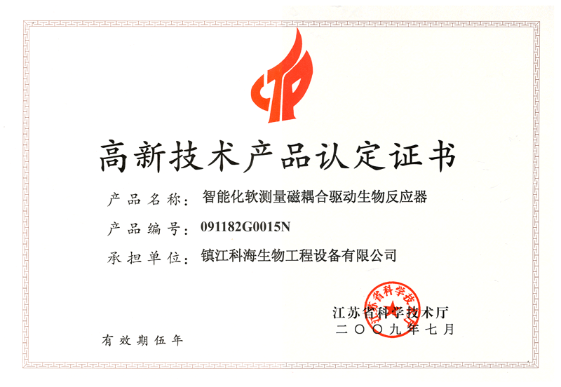经江苏省科技厅审核通过公司制造的“智能化软测量磁耦驱动生物反应器”产品获得“高新技术产品认定证书”。产品编号:091182G0015N。