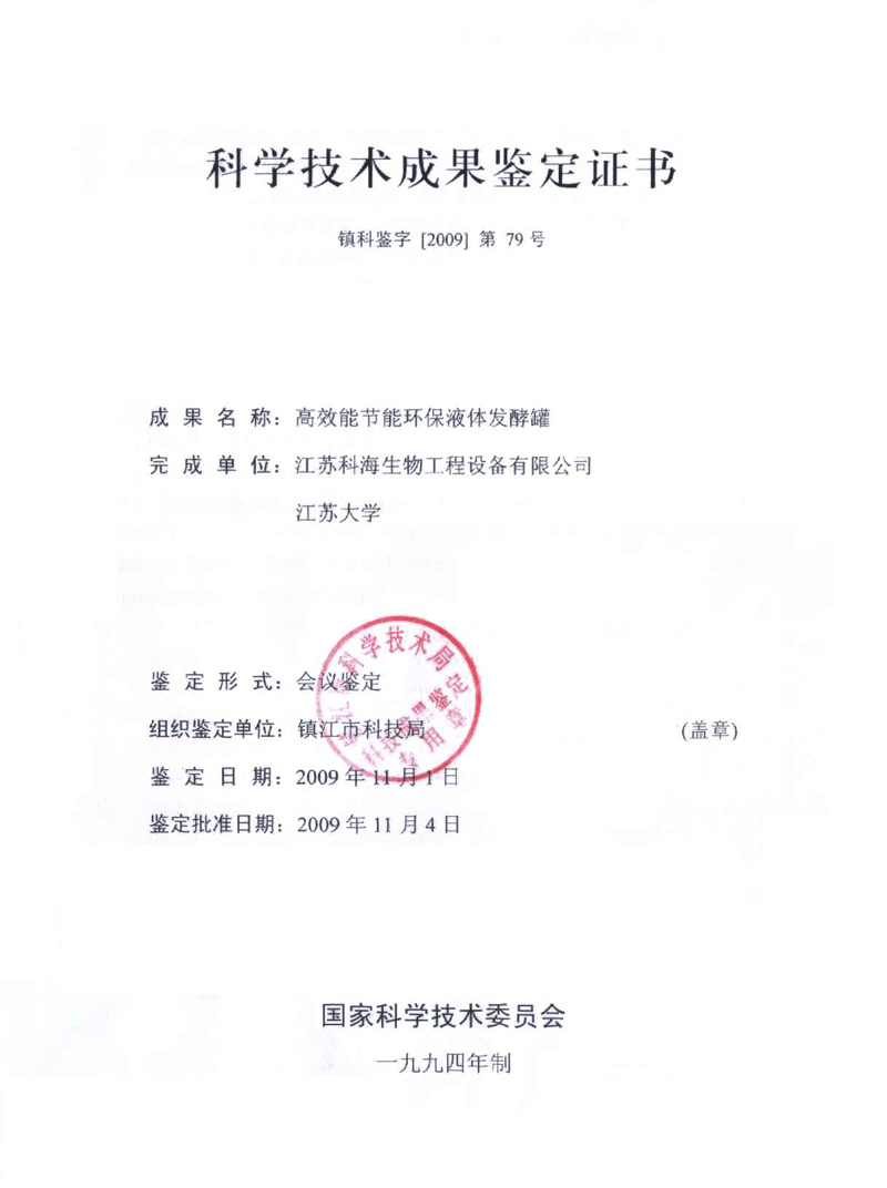 公司与江苏大学联合研发“高效能节能环保液体发酵罐”产品,由“镇江市科技术局” 、“江苏省经济贸易委员会”联合组织鉴定,鉴定圆满成功。证书编号:镇科鉴字(2009)第79号、苏经贸鉴字(2008)462号。